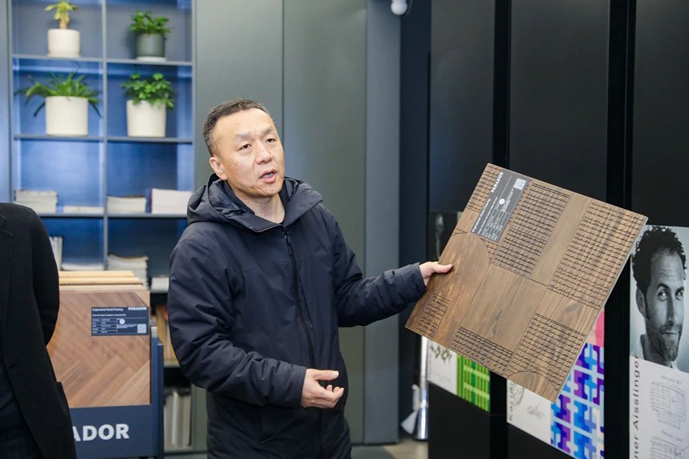 为此,她开始丰富自己的地板品类,使得可以即时响应客户形形色色的需求,给予其合适的解决方案,慢慢的,她建立起自创的产品品牌——集木研选,并寻找合适的合作伙伴,荷兰小伙Chris就是其中一位,当天,崔女士也将他从上海邀请过来与我们交流。